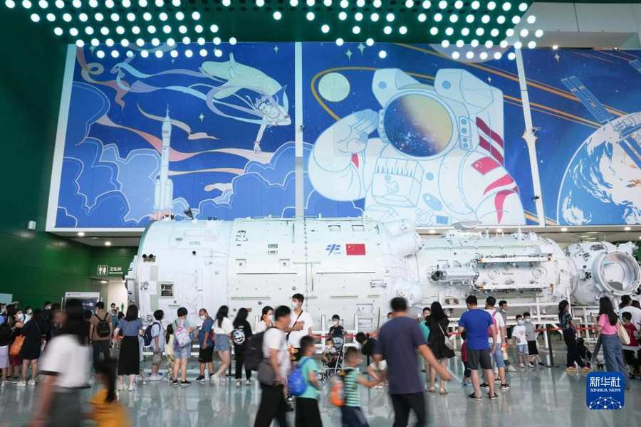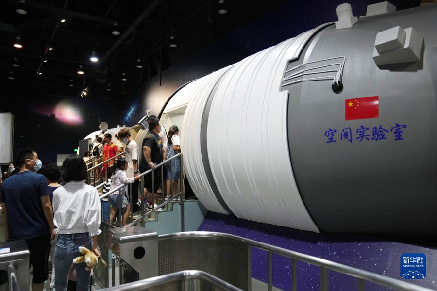 1/08月14日,在中國科學(xué)技術(shù)館,參觀者排隊參觀神舟飛船和空間實驗室大型仿真模型。(新華社記者 鞠煥宗/攝)