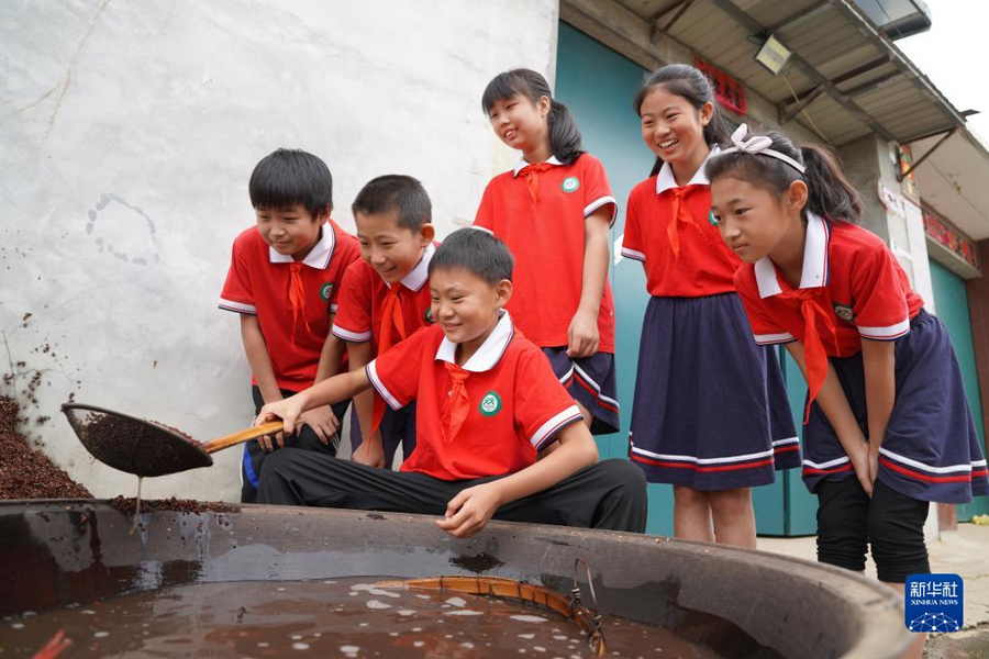 1/08月27日,河北省邢臺市內(nèi)丘縣柳林鎮(zhèn)明德小學學生在體驗酸棗仁加工技藝。(新華社發(fā) 劉繼東/攝)