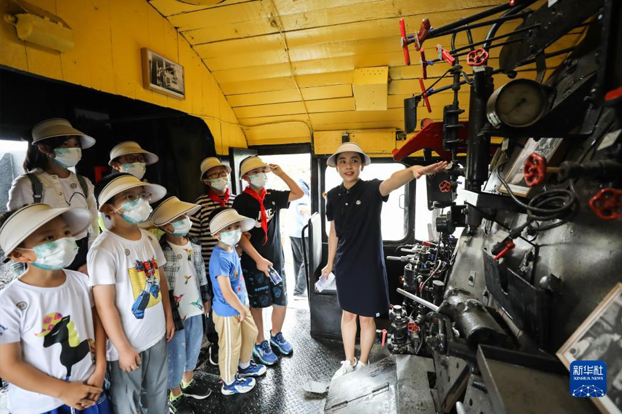 1/08月26日,來自陜西西安部分學校的22名小學生在西鐵教育培訓基地參觀老式蒸汽機車駕駛室。(新華社發(fā) 劉翔/攝)