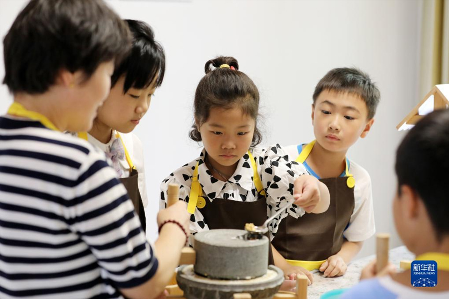 1/08月27日,在山東省臨沂市郯城縣郯城街道龍泉社區(qū)黨群服務中心,社區(qū)居民教孩子們使用石磨。(新華社發(fā) 張春雷/攝)