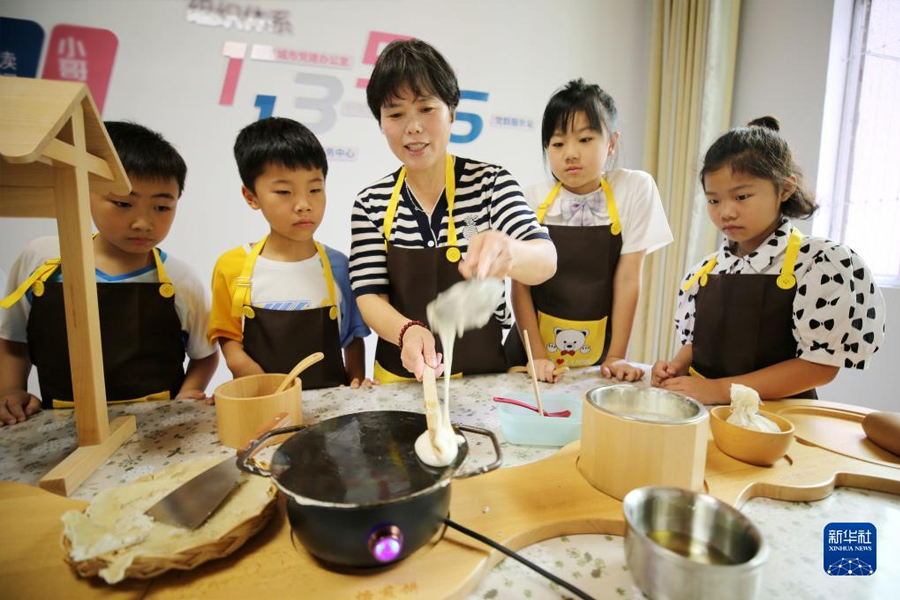 1/08月27日,在山東省臨沂市郯城縣郯城街道龍泉社區(qū)黨群服務中心,社區(qū)居民教孩子們烙制傳統(tǒng)手工煎餅。(新華社發(fā) 張春雷/攝)
