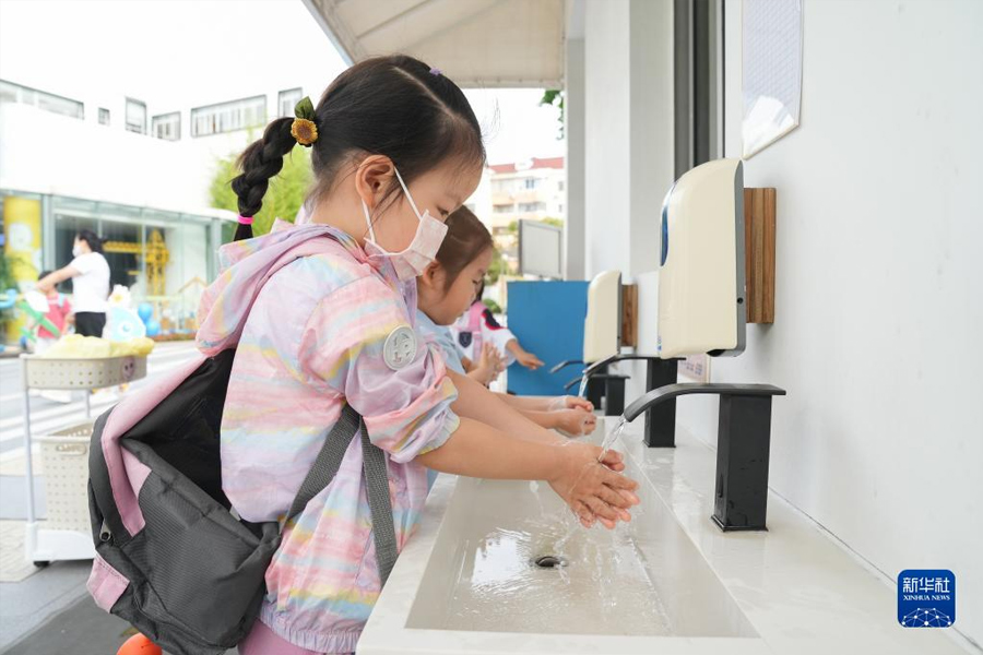 1/09月1日,在上海市徐匯區(qū)科技幼兒園,孩子們在水池前洗手。(新華社記者 丁汀/攝)