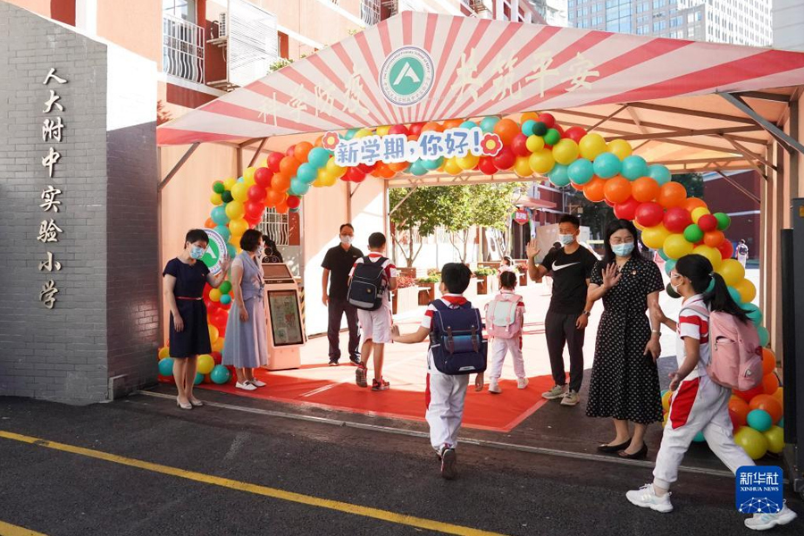1/09月1日,北京人大附中實驗小學(xué)學(xué)生進入校園。(新華社記者 任超/攝)