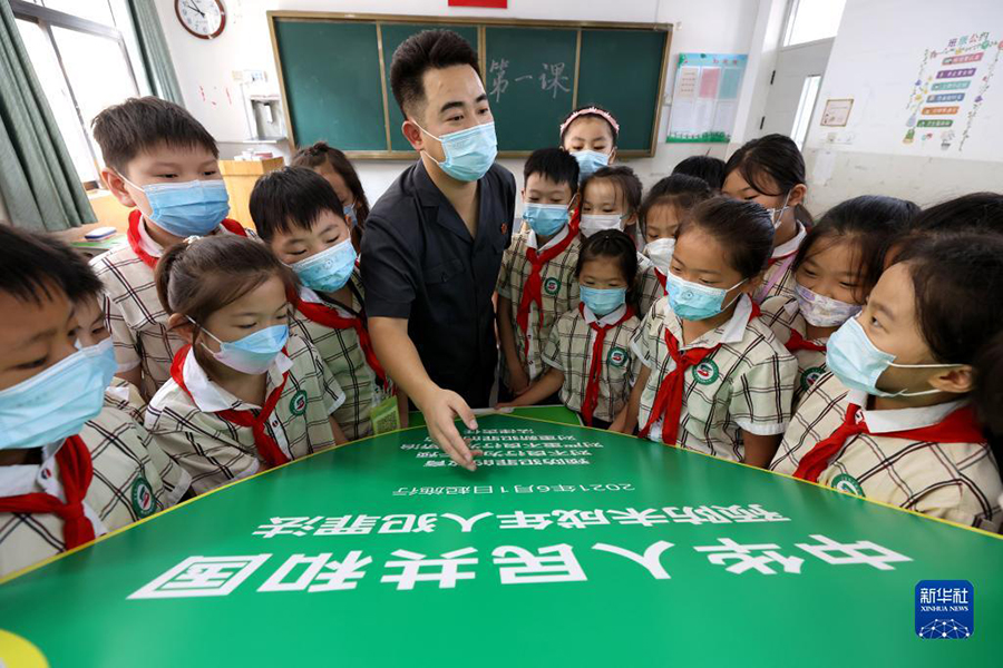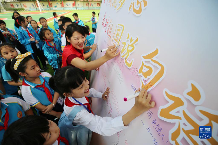 1/09月1日,山東省郯城縣郯城街道龍泉社區(qū)工作者與小學(xué)生一起寫下對祖國的祝福語。(新華社發(fā) 張春雷/攝)