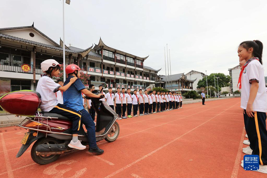 1/09月1日,湖南省張家界市武陵源區(qū)索溪峪中心學(xué)校的學(xué)生在上“交通安全第一課”。(新華社發(fā) 吳勇兵/攝)
