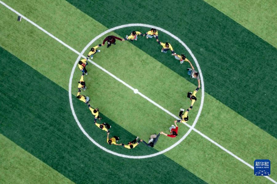 1/09月1日,貴州省黔西市定新小學(xué)學(xué)生在操場上做游戲(無人機(jī)照片)。(新華社發(fā) 范暉/攝)