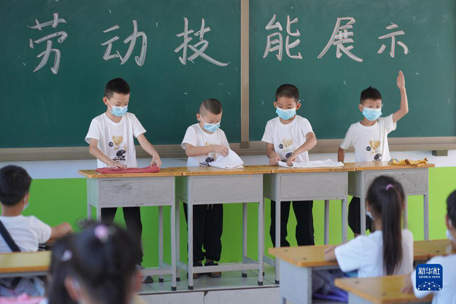 1/09月1日,河北省邢臺市內(nèi)丘縣西陽小學(xué)學(xué)生在開學(xué)第一課上比拼勞動技能。(新華社發(fā) 劉繼東/攝)