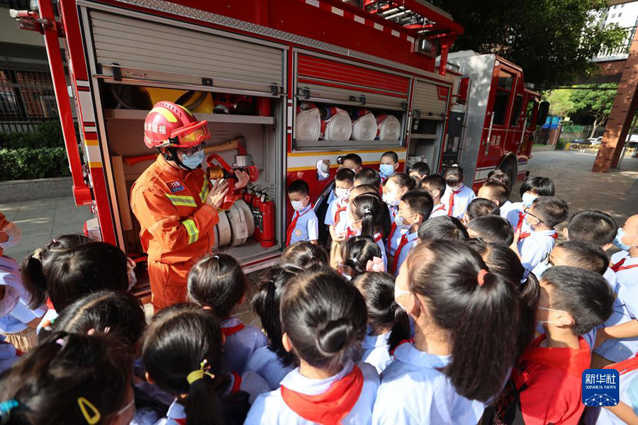 1/09月1日,在福建省廈門市金安小學(xué),消防員向小學(xué)生們講解消防器材裝備的使用方法。(新華社發(fā) 曾德猛/攝)