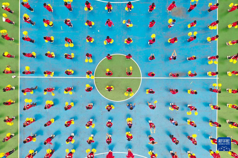 1/09月1日,貴州省貴陽市開陽縣第一小學(xué)學(xué)生在跳自編舞《天天向上》(無人機(jī)照片)。(新華社發(fā) 袁福洪/攝)