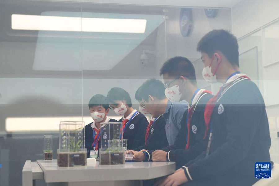 1/010月12日,在中科院空間應(yīng)用工程與技術(shù)中心地面主課堂,學(xué)生收看“天宮課堂”第三課時做實驗。(新華社記者 羅曉光/攝)