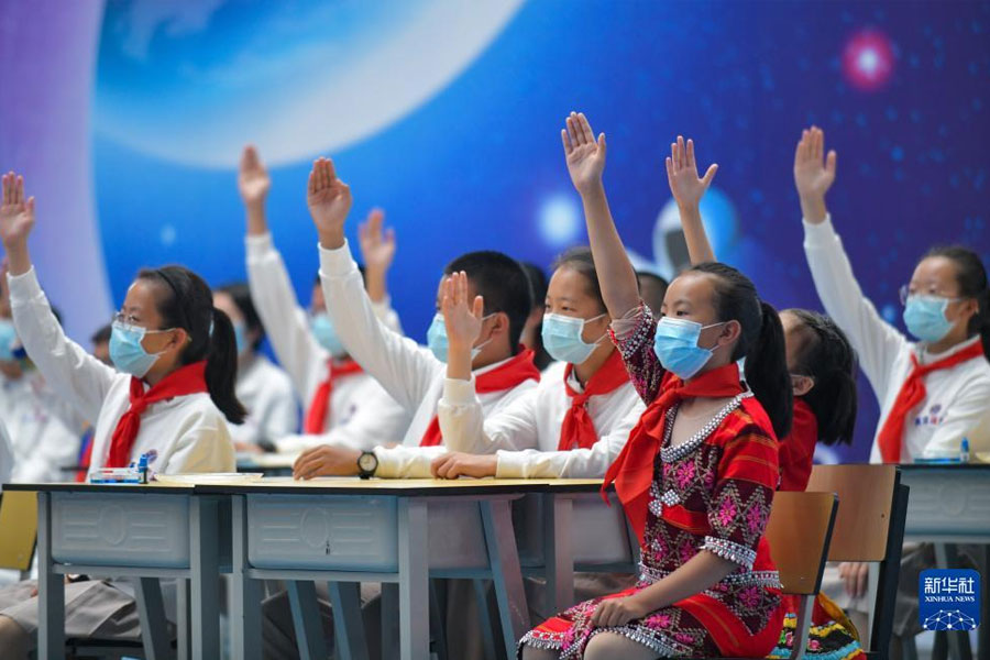1/010月12日,學(xué)生在云南省大理新世紀中學(xué)收看“天宮課堂”第三課時向航天員提問。當(dāng)日下午,“天宮課堂”第三課在中國空間站正式開講并直播,神舟十四號飛行乘組航天員陳冬、劉洋、蔡旭哲進行太空授課。本次授課的地面主課堂設(shè)在中科院空間應(yīng)用工程與技術(shù)中心,同時在山東省菏澤第一中學(xué)、河南省科技館、云南省大理新世紀中學(xué)設(shè)置了3個地面分課堂。(新華社記者 陳欣波/攝)