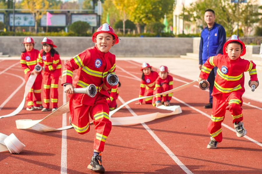 1/011月9日,在浙江省長興縣煤山鎮(zhèn)中心小學(xué),學(xué)生在體驗消防員體能訓(xùn)練。(新華社發(fā) 吳拯/攝)