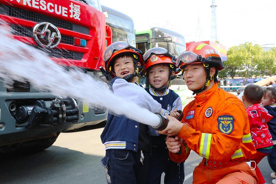 1/011月9日,在湖南省新田縣,小朋友在消防員的指導(dǎo)下體驗消防水槍。(新華社發(fā) 劉貴雄/攝)