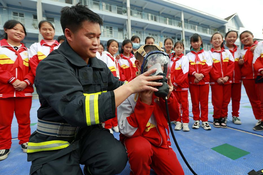 1/011月9日,在貴州甕安六小,學(xué)生在消防員的指導(dǎo)下體驗佩戴防毒面罩。(新華社發(fā) 肖偉/攝)