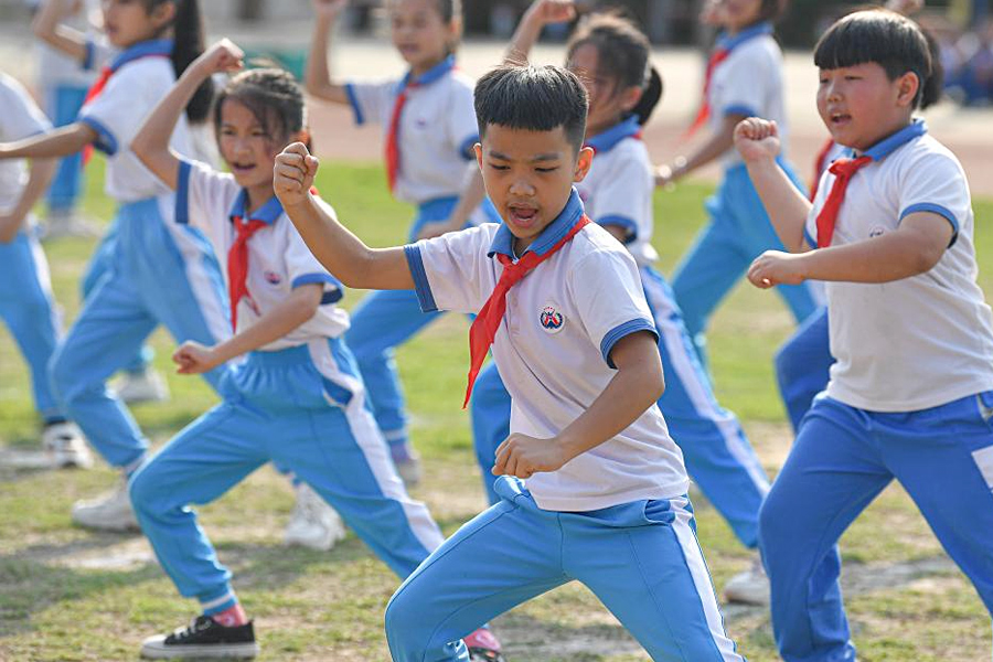 1/02月13日,海南省屯昌縣新興中心小學(xué)學(xué)生在演練武術(shù)。(新華社記者 蒲曉旭/攝)
