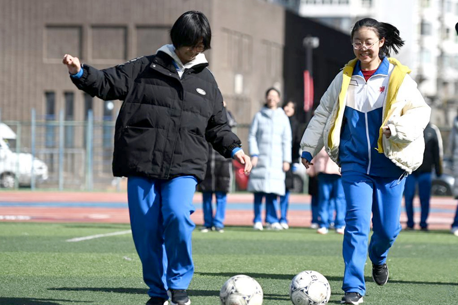 1/02月13日,天津市耀華中學(xué)學(xué)生在體育課上踢足球。(新華社記者 趙子碩/攝)