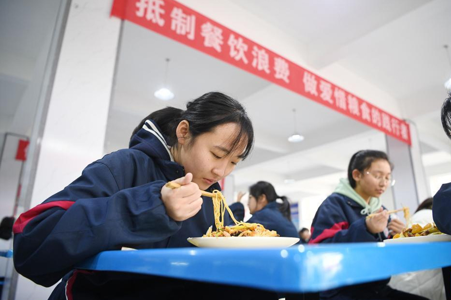 1/02月13日,寧夏育才中學(xué)學(xué)生在食堂懸掛的“光盤行動(dòng)”橫幅前就餐。(新華社記者 王鵬/攝)