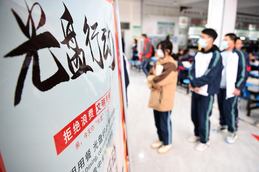 1/02月13日,寧夏育才中學(xué)學(xué)生在食堂擺放的“光盤行動(dòng)”公益廣告前排隊(duì)。(新華社記者 王鵬/攝)