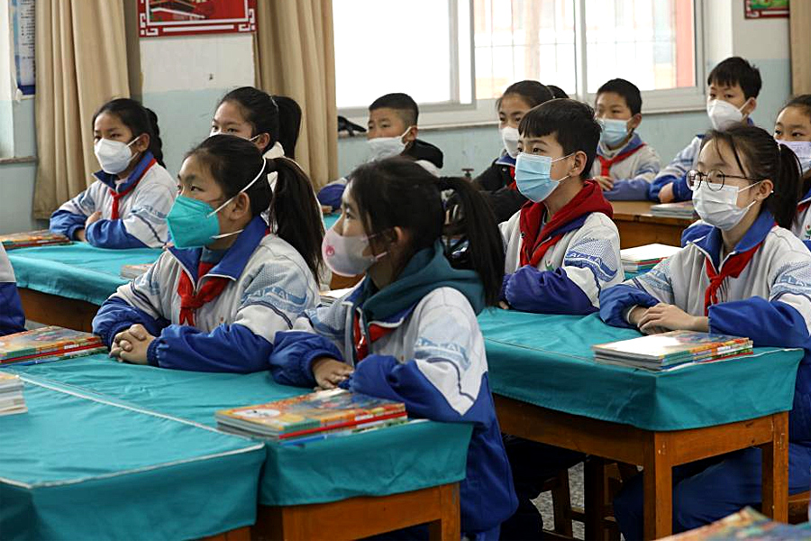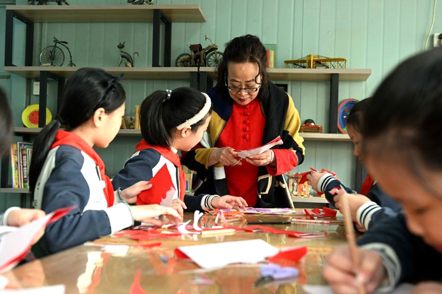 1/02月28日,國家級非遺蔚縣剪紙代表性傳承人在石家莊市東風小學非遺工坊給學生傳授剪紙技藝。(新華社發(fā) 陳其保/攝)