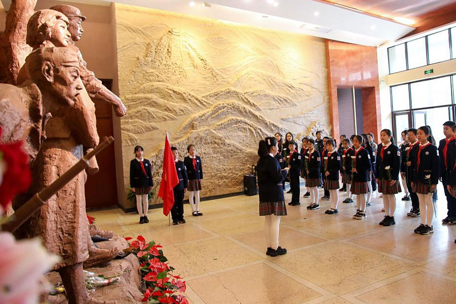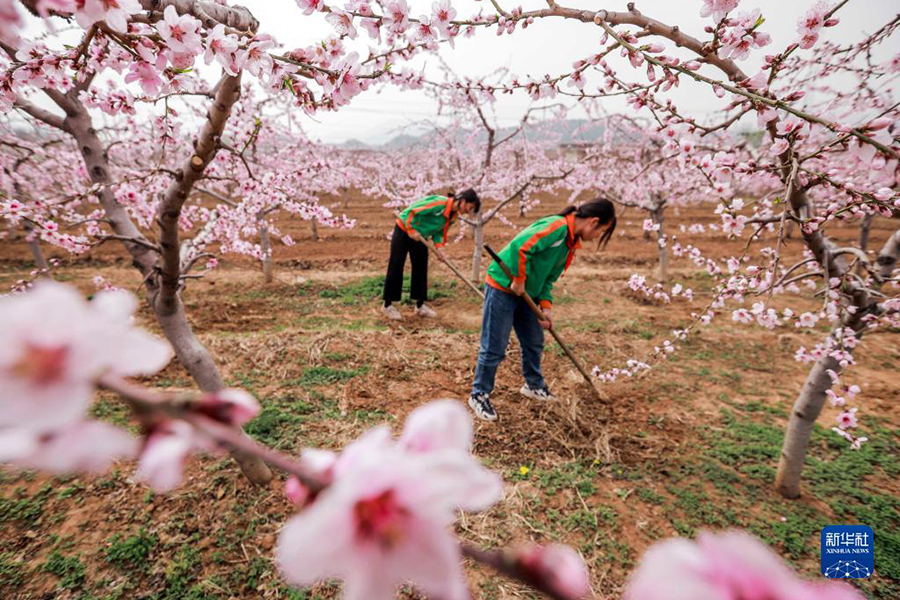 1/04月10日,河北省遵化市東舊寨鎮(zhèn)梁屯中心小學(xué)的學(xué)生在桃樹(shù)果園體驗(yàn)鋤草勞動(dòng)。(新華社發(fā) 劉滿倉(cāng)/攝)