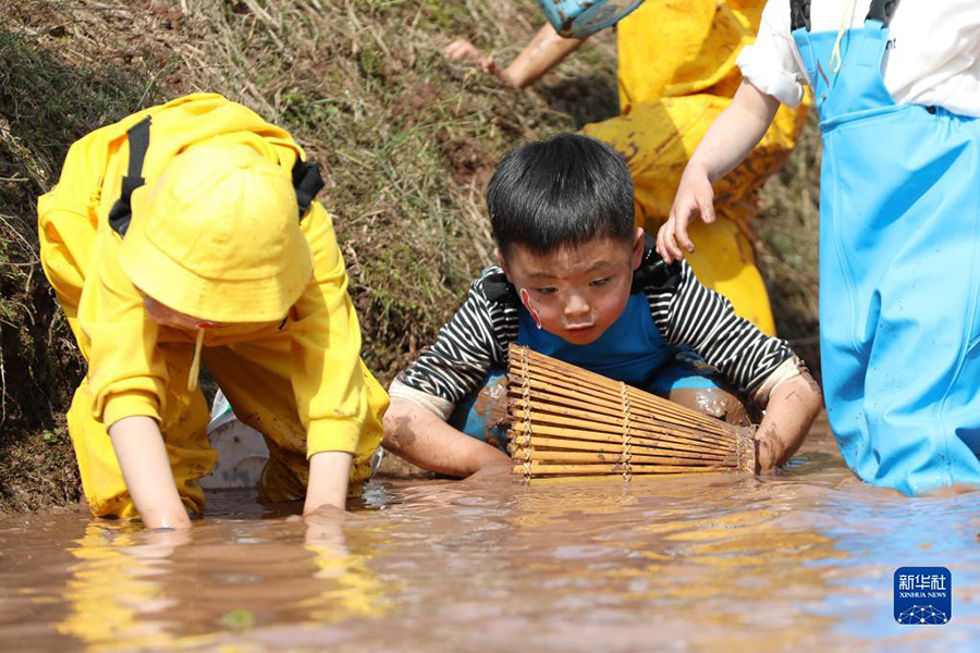 1/04月10日,四川省廣安市武勝縣東方紅幼兒園的小朋友在龍女鎮(zhèn)的稻田里抓魚(yú)。(新華社發(fā) 夏俊林/攝)
