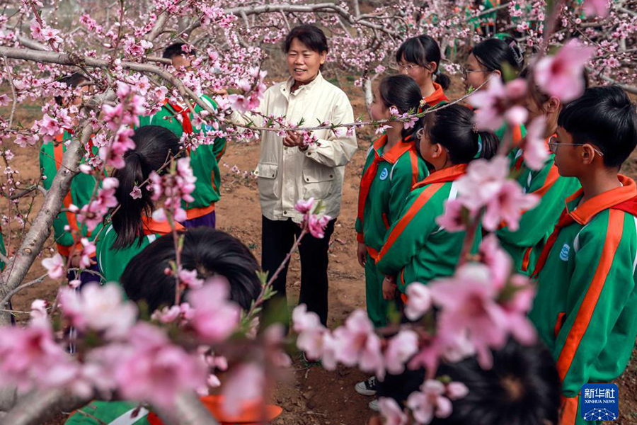 1/04月10日,技術(shù)人員在桃樹(shù)果園向河北省遵化市東舊寨鎮(zhèn)梁屯中心小學(xué)的學(xué)生介紹桃樹(shù)生長(zhǎng)知識(shí)。(新華社發(fā) 劉滿倉(cāng)/攝)