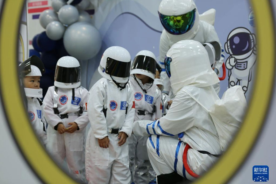 1/04月22日,在山東省臨沂市沂南縣舉辦的中國航天日主題科普活動上,孩子們在體驗“宇航服”。(新華社發(fā) 王彥冰/攝)