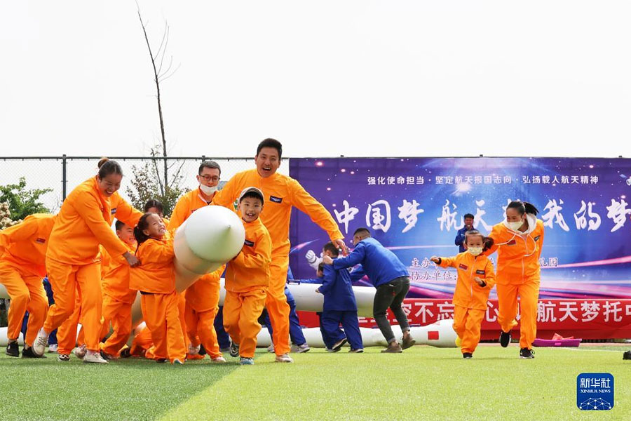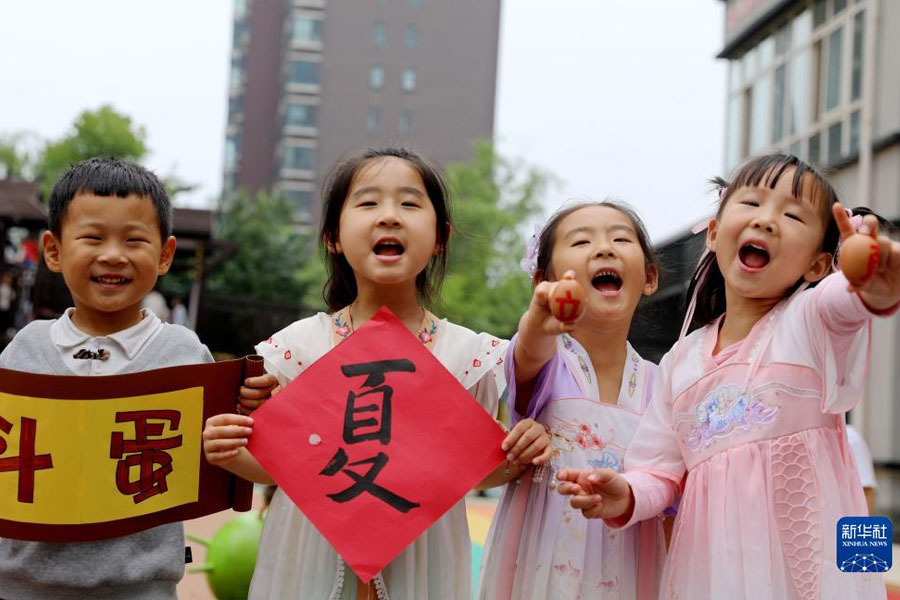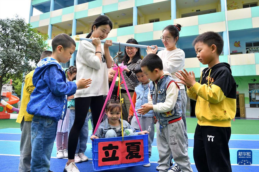 1/05月5日,河南省濟(jì)源市第一幼兒園的孩子體驗(yàn)立夏習(xí)俗。(新華社發(fā) 段二平/攝)