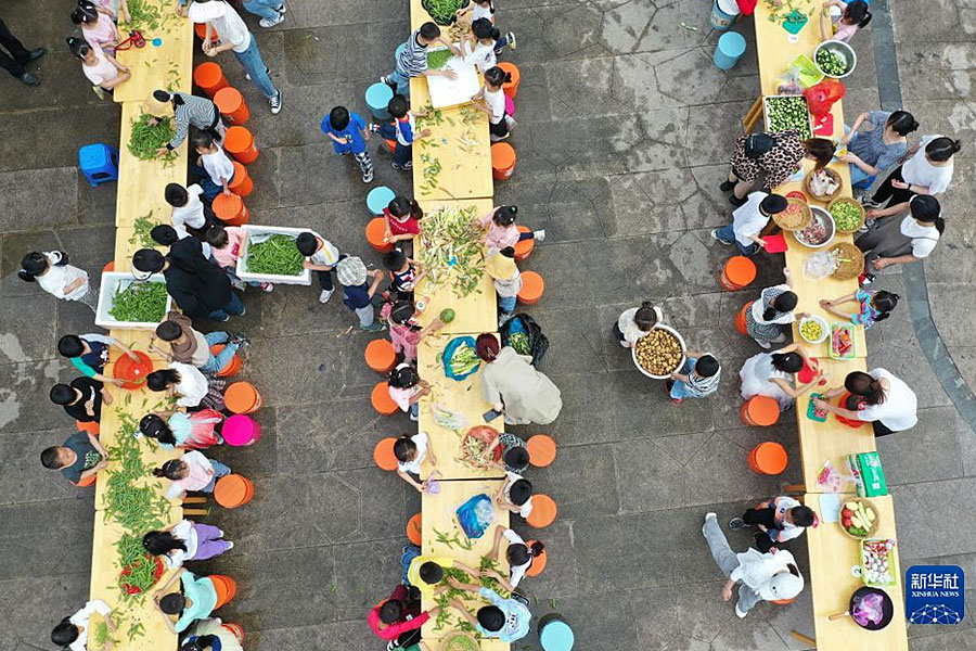 1/05月5日,浙江省湖州市德清縣乾元鎮(zhèn)第二幼兒園的孩子和老師在整理燒立夏飯的食材(無人機(jī)照片)。(新華社發(fā) 倪立芳/攝)