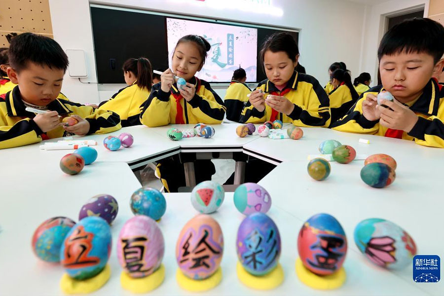 1/05月5日,浙江省臺州市仙居縣中心幼兒園的小朋友在老師的指導(dǎo)下繪立夏彩蛋。(新華社發(fā) 王華斌/攝)
