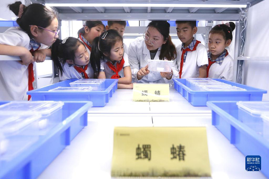1/05月22日,小學(xué)生在中國(guó)農(nóng)業(yè)科學(xué)院青島特種作物研究中心試驗(yàn)基地學(xué)習(xí)昆蟲知識(shí)。(新華社發(fā) 梁孝鵬/攝)