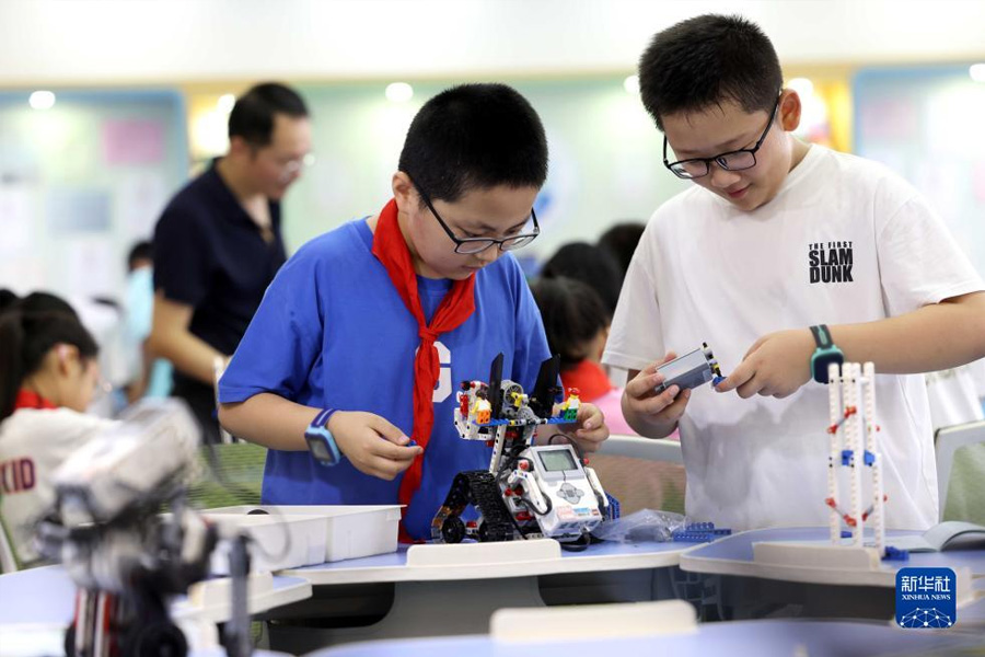 1/07月21日,在安徽省合肥市郎溪路小學(xué)少年宮,孩子們?cè)谑钇诳苿?chuàng)課上組裝機(jī)器人。(新華社發(fā) 解琛/攝)
