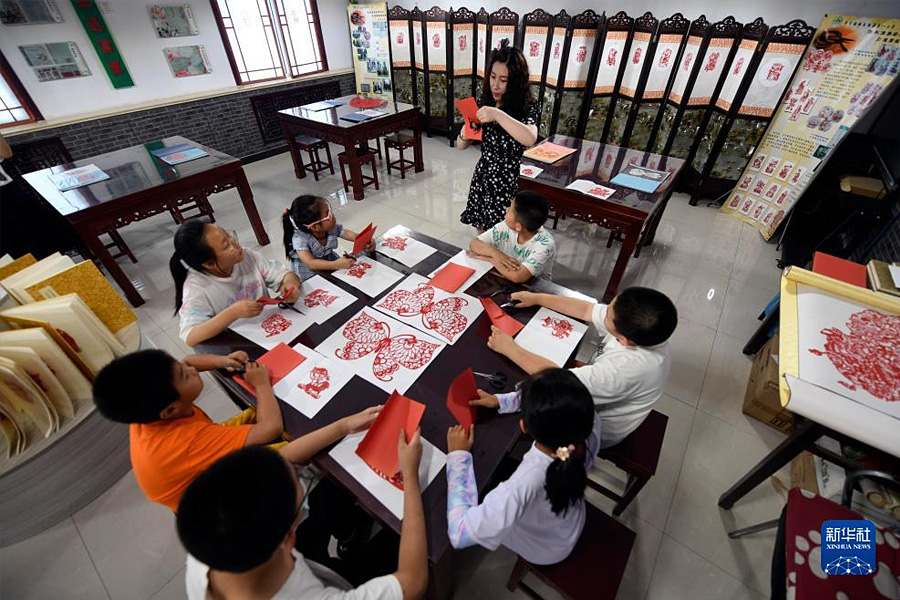 1/07月21日,在河北省豐寧縣暑假“非遺小課堂”,豐寧縣第一小學(xué)教師任洪茹為學(xué)生講解剪紙技藝。(新華社發(fā) 王立群/攝)