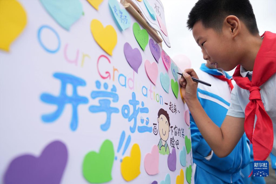 1/09月1日,湖北省武昌實驗中學沙湖學校學生步入校園后合影。當日,全國多地學校迎來秋季開學。(新華社記者 肖藝九/攝)