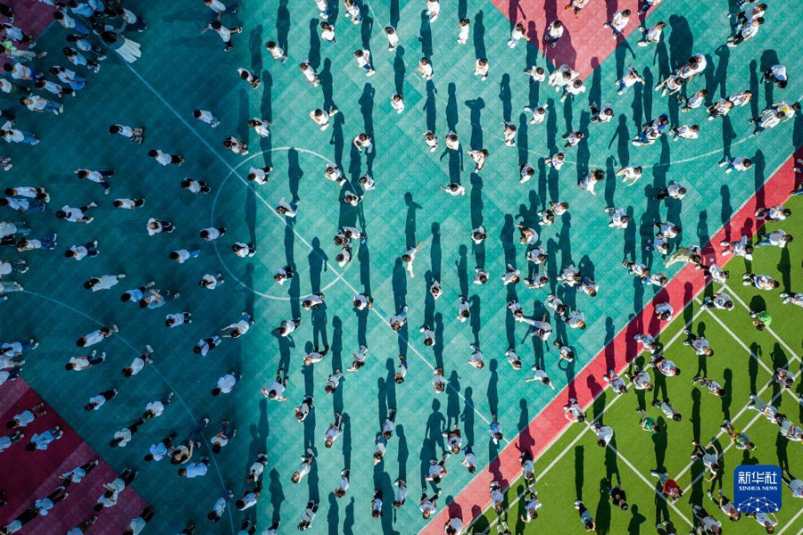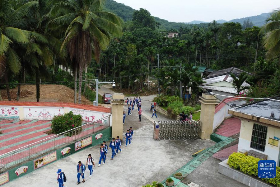 1/09月1日,海南省瓊中黎族苗族自治縣高田小學學生走入校園開啟新學期(無人機照片)。(新華社記者 楊冠宇/攝)