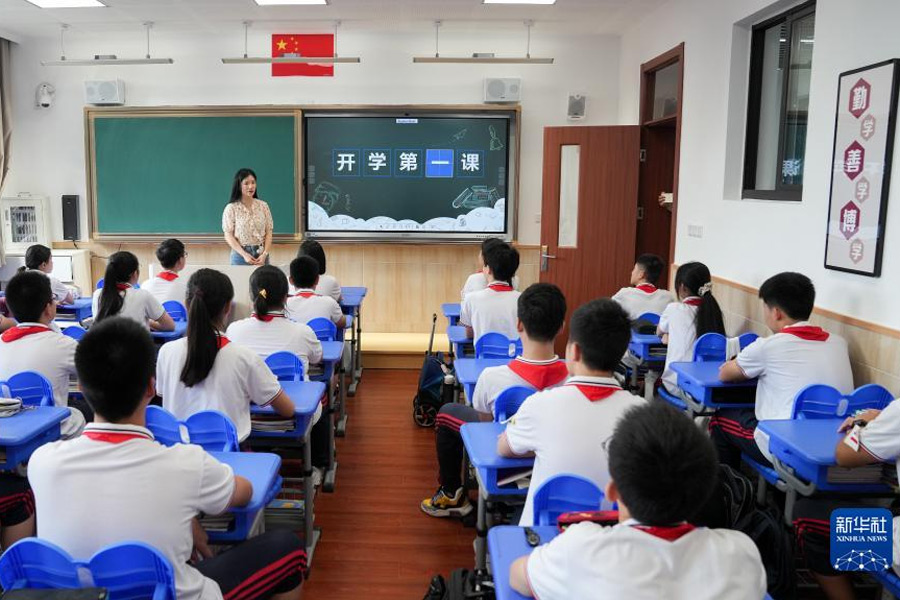 1/09月1日,湖北省武昌實驗中學沙湖學校一年級新生在上開學第一課。(新華社記者 肖藝九/攝)