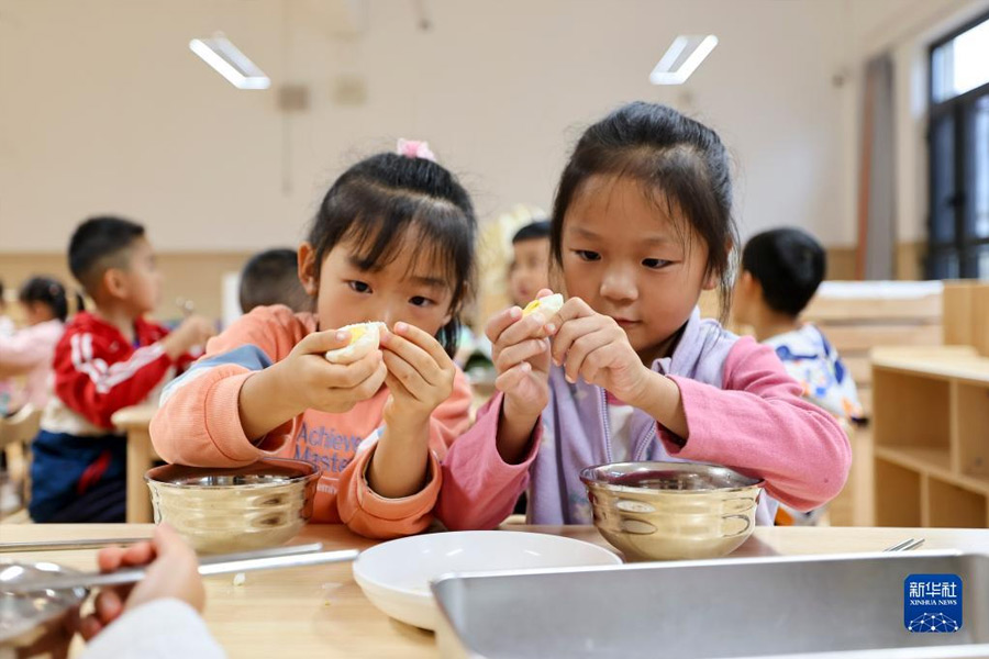1/09月1日,在云南省昆明市西山區(qū)前衛(wèi)幼兒園,小朋友們在吃早餐。(新華社記者 崔文/攝)