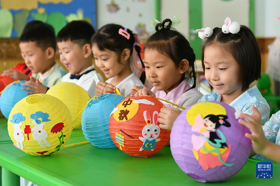 1/09月27日,山東省煙臺市福山區(qū)清洋街道中心幼兒園的小朋友在制作中秋花燈。(新華社發(fā) 孫文潭/攝)