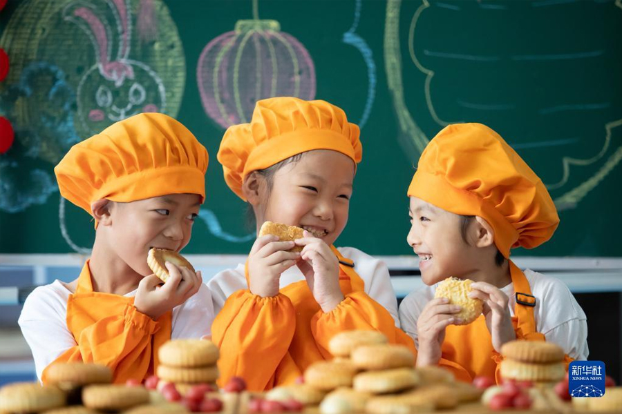 1/09月27日,河北省邯鄲市肥鄉(xiāng)區(qū)肥鄉(xiāng)鎮(zhèn)第二幼兒園的小朋友在品嘗自己親手制作的月餅。(新華社發(fā) 薛建東/攝)