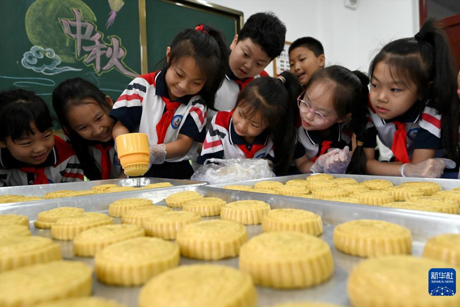 1/09月27日,河北省邯鄲市邯山區(qū)實驗中學(xué)小學(xué)部的學(xué)生在制作月餅。(新華社發(fā) 郝群英/攝)