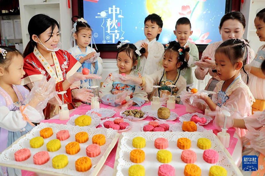 1/09月27日,在山東省東營市東營區(qū)實驗幼兒園,學(xué)生在老師的指導(dǎo)下體驗制作月餅。(新華社發(fā) 劉智峰/攝)