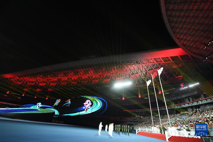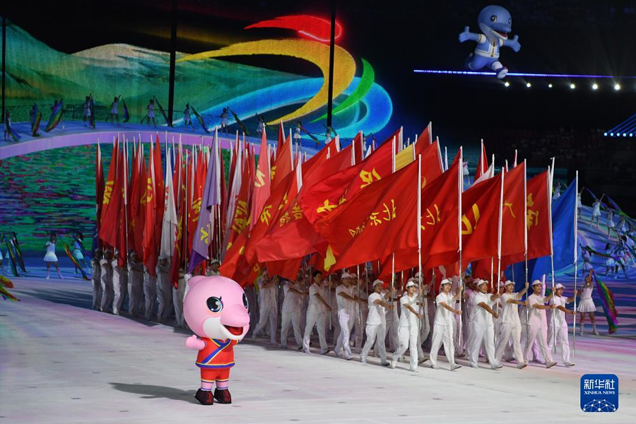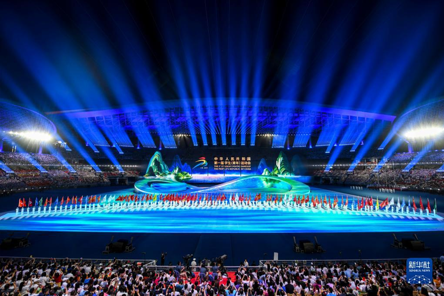 1/011月5日,中華人民共和國學生(青年)運動會會旗、中華人民共和國第一屆學生(青年)運動會會旗在開幕式上入場。(新華社記者 胡星宇/攝)