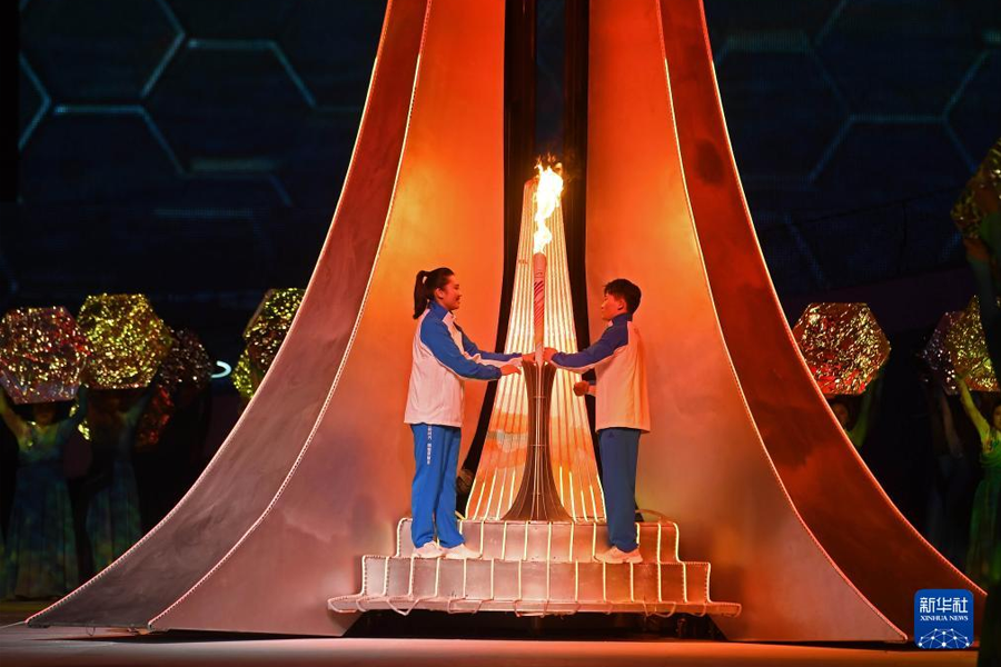 1/011月5日,火炬手黃雅晴(左)、蘭星宇點燃主火炬。(新華社記者 侯昭康/攝)