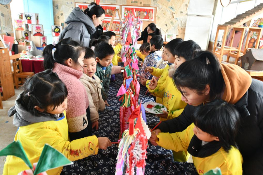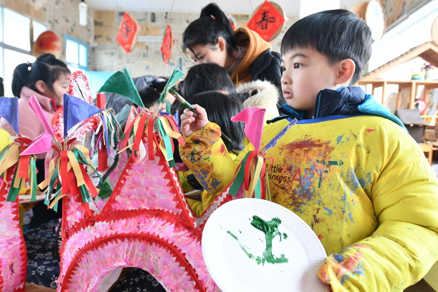 1/01月29日,浙江省建德市航頭中心幼兒園的孩子在老師指導(dǎo)下為“板凳龍”添色。新春佳節(jié)臨近,浙江省建德市航頭中心幼兒園開展“尋年味 憶童趣”主題活動,讓孩子們了解家鄉(xiāng)“板凳龍”文化,體驗(yàn)手工技藝,感受傳統(tǒng)民俗文化的魅力。(新華社發(fā) 寧文武/攝)