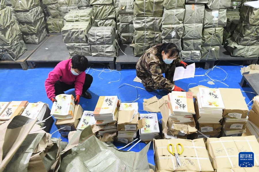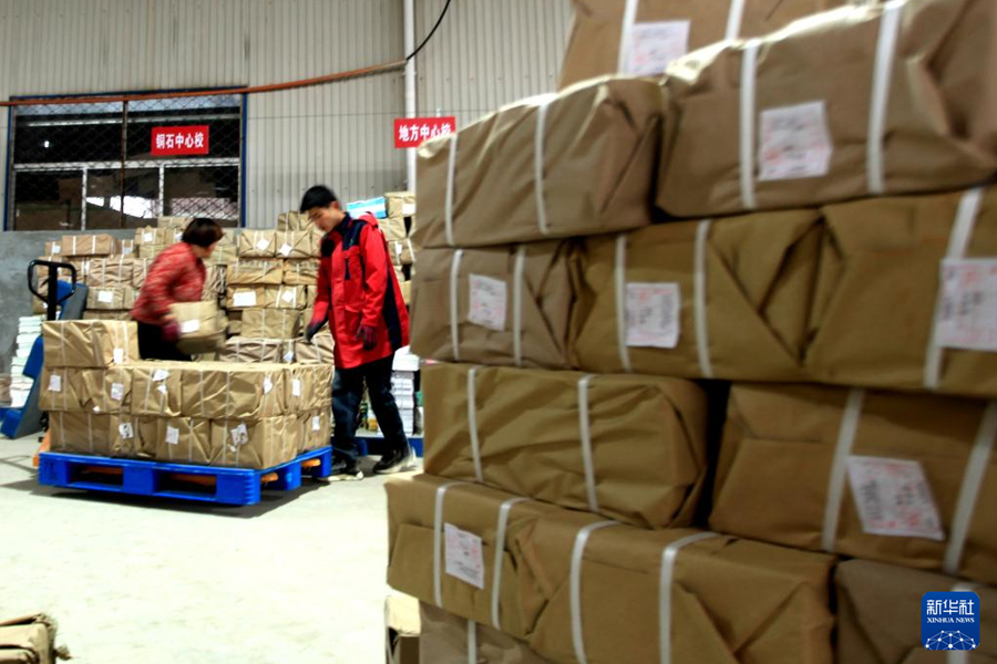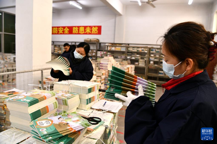 1/02月22日,工作人員在河北省石家莊新樂(lè)市新華書店倉(cāng)庫(kù)整理中小學(xué)教材,準(zhǔn)備送往各學(xué)校。(新華社發(fā) 賈敏杰/攝)