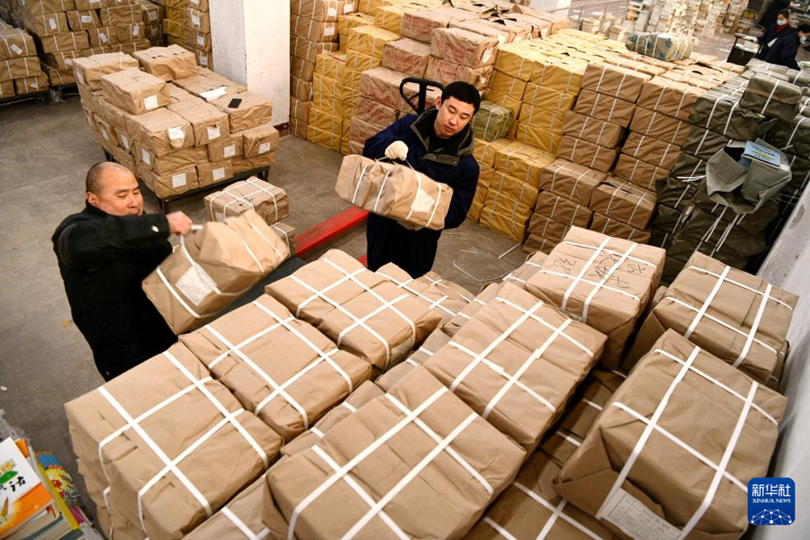 1/02月21日,在山東省臨沂市平邑縣新華書店倉(cāng)庫(kù),工作人員在搬運(yùn)教材。(新華社發(fā) 武紀(jì)全/攝)