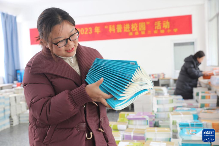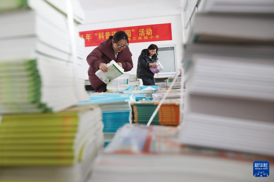 1/02月22日,河南省焦作市溫縣第三實(shí)驗(yàn)小學(xué)教師在整理、分發(fā)教材。(新華社發(fā) 徐宏星/攝)