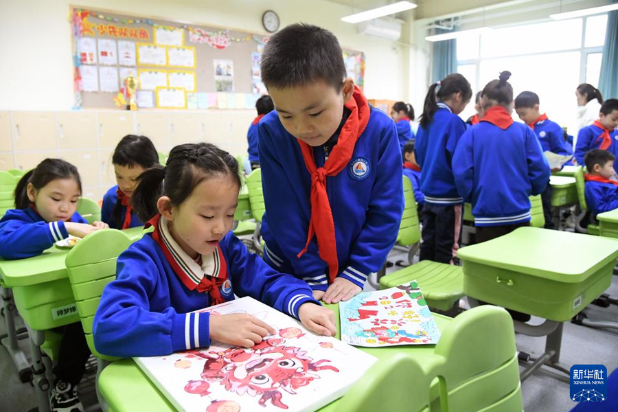 1/02月26日,在北京市海淀區(qū)中關(guān)村第四小學(xué),二年級(jí)的學(xué)生在開(kāi)學(xué)第一課中交流。(新華社記者 任超/攝)