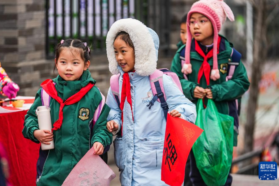 1/02月26日,在北京市海淀區(qū)中關(guān)村第四小學(xué),學(xué)生與老師相互問(wèn)候。當(dāng)日,全國(guó)多地中小學(xué)開(kāi)學(xué),師生迎接新學(xué)期的開(kāi)始。(新華社記者 任超/攝)