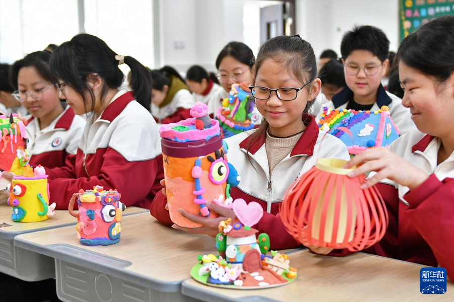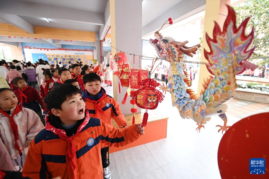 1/02月26日,湖北省襄陽(yáng)市海容小學(xué)學(xué)生在校園觀(guān)賞剪紙繪畫(huà)燈籠等作品。(新華社發(fā) 謝勇/攝)